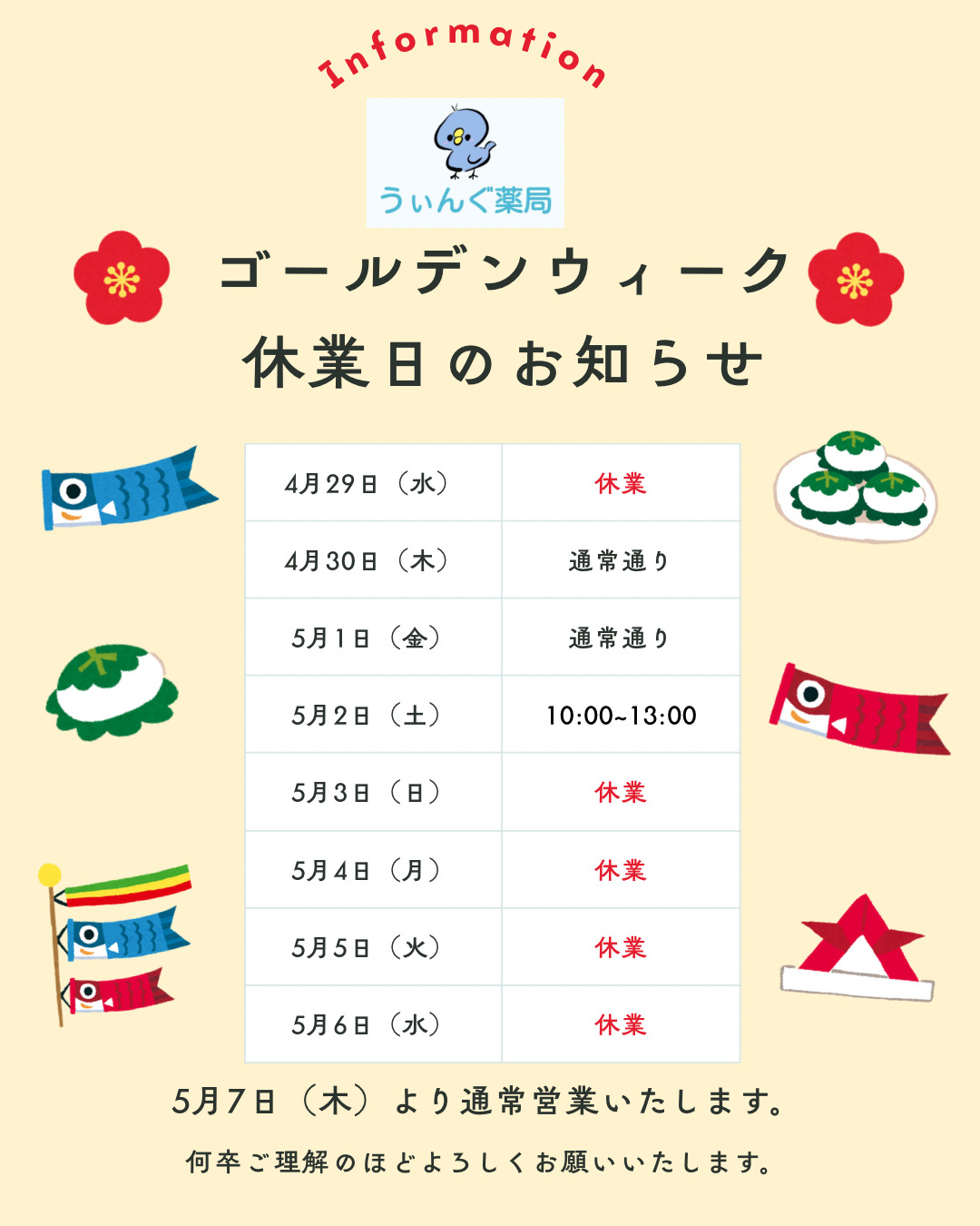 🎏GW期間中の薬局営業日について